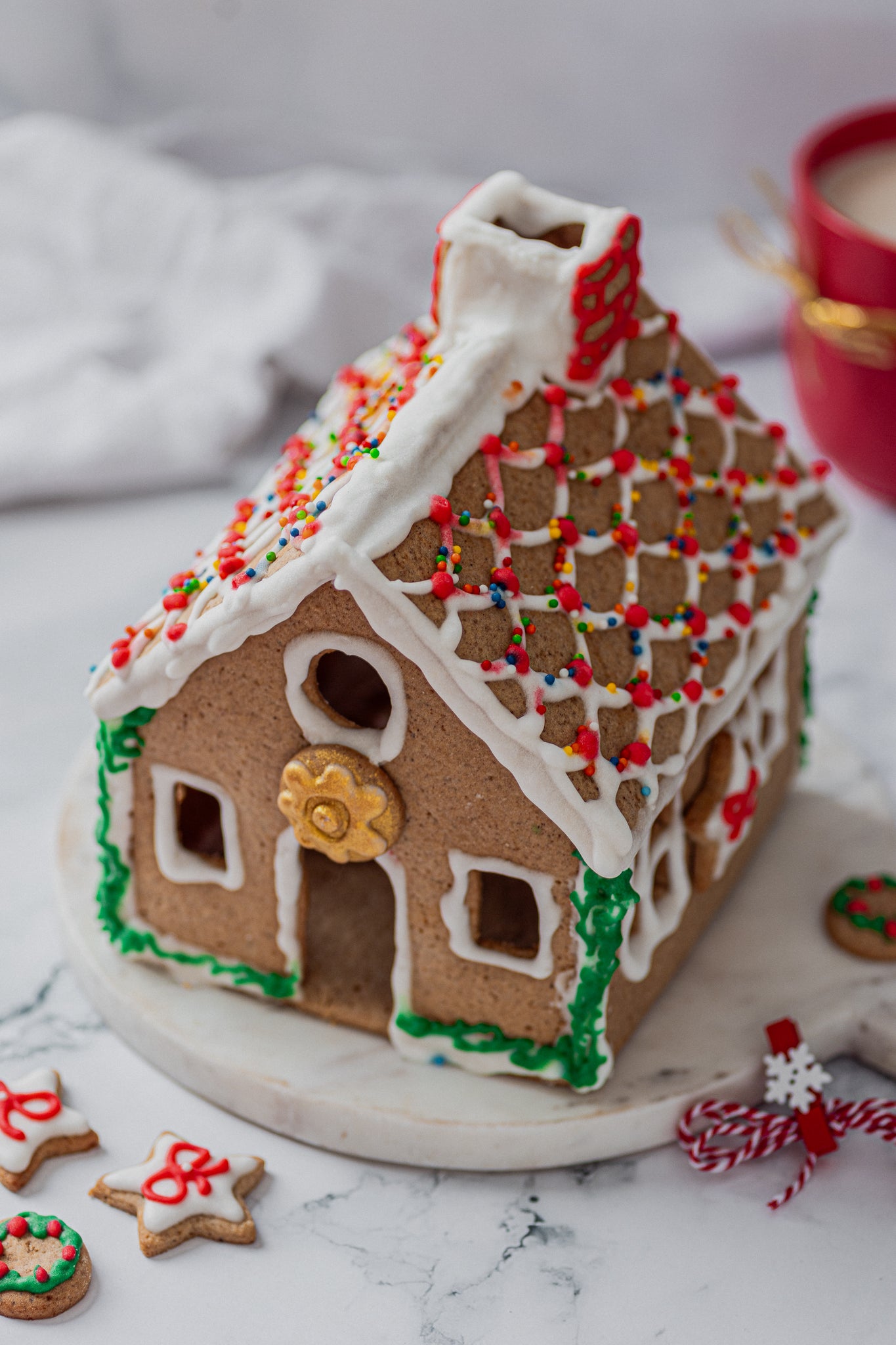 - Con la casa ya firme, agrega más glaseado en las uniones para simular nieve y decora a gusto con los sprinkles y galletitas restantes.